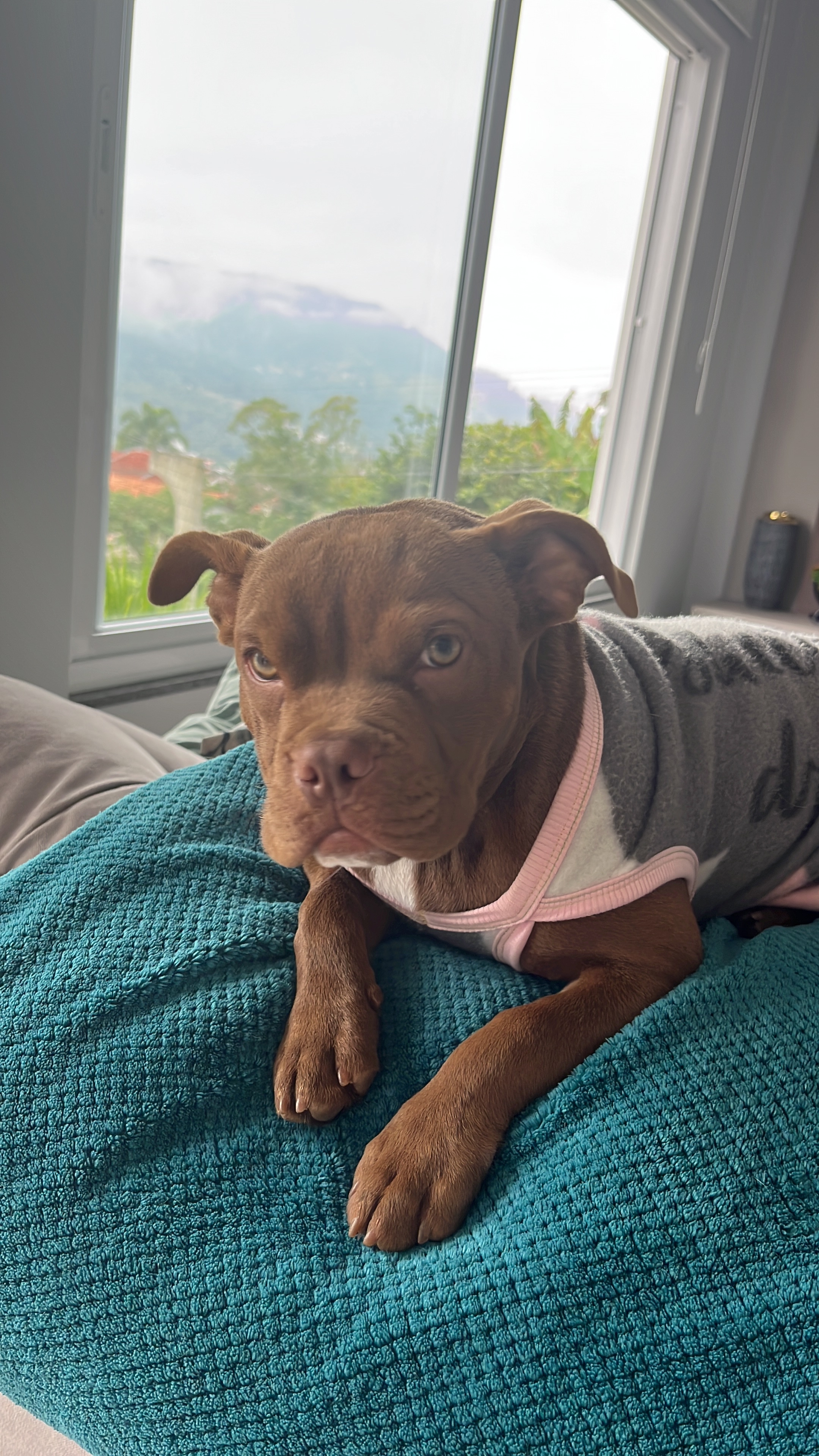 Ela é uma American Bully muito dócil e amável, adora ficar na companhia de pessoas.