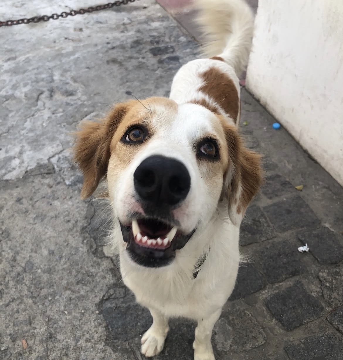 Possue pelo branco,com manchas marrons e olhos claros,ele está com a coleira da cor marrom,com o nome e o @ do perfil dele.Fale com a dona: Ninna (73) 982001717